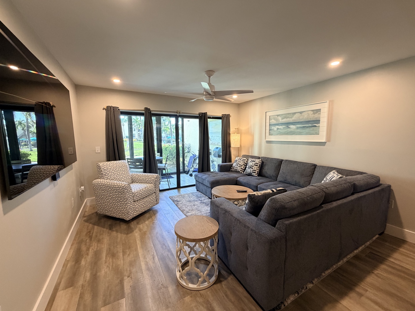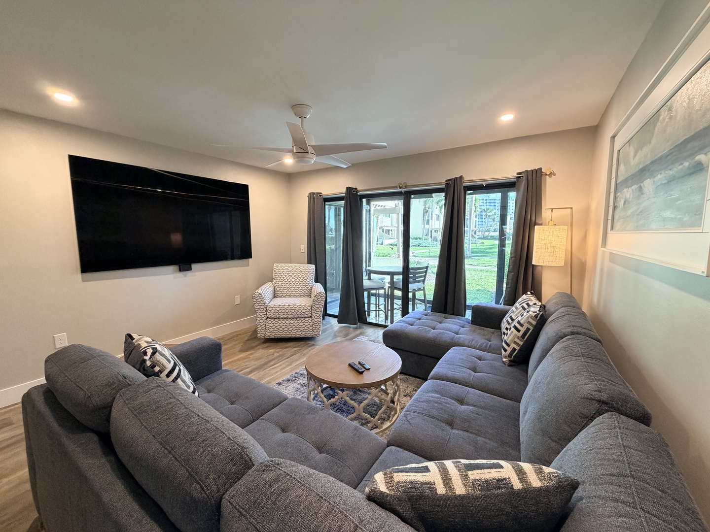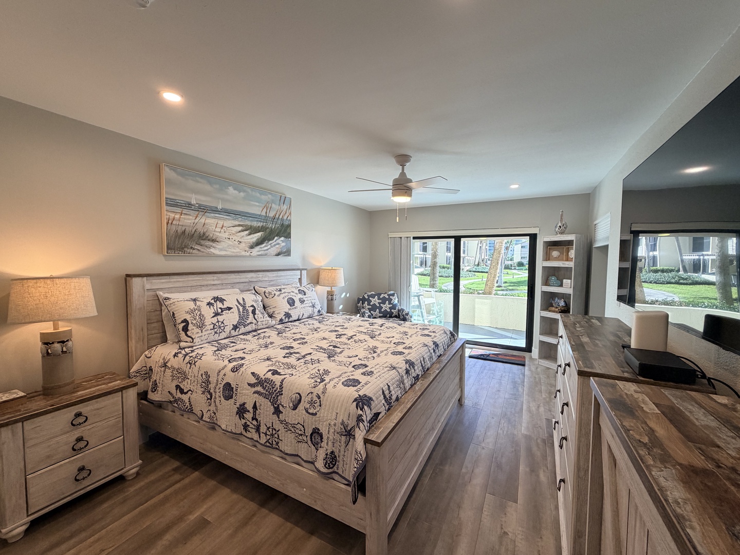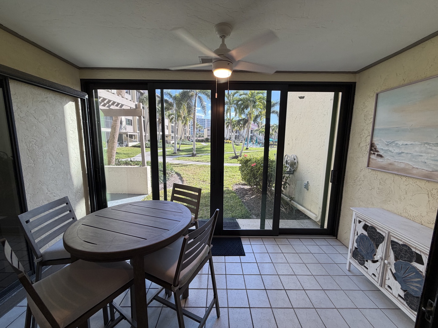 Enjoy this newly renovated ground floor gulf-view unit, just steps to the pool and a short walk past the sun deck to the white sandy beach. This unit comfortably sleeps six: the master bedroom has a king bed, the guest bedroom has a twin bed and a full bed, and the living room has a sectional sleeper sofa. The kitchen is fully equipped, and both the master bedroom and guest bedroom closets have custom closet systems. This unit has an outside patio area off the master bedroom and a screened-in lanai off the living room. All of the comforts of home for your Siesta Key vacation. *Kitchen and lanai to be remodeled early Summer 2026.*