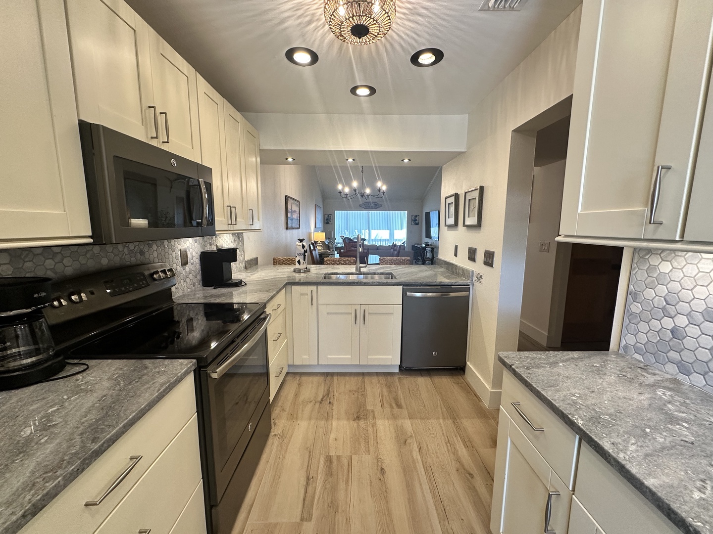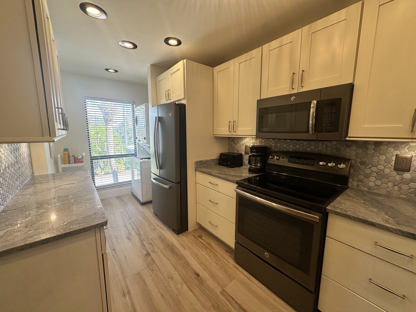 Welcome to your beach paradise! Come relax and unwind in this beautifully newly renovated condo. Enjoy the peace and tranquility of the garden view while relaxing in your lanai. You will enjoy the openness feeling with the vaulted ceiling. Ceramic plank tiling and mosaic natural stone flooring throughout. Fully equipped kitchen with stainless steel appliances, in addition to coffee maker, Keurig machine, blender. In condo washer/dryer. Bedrooms include master with a king bed and walk in closet and guest with two twin beds and walk in closet . Enjoy a new 75 inch TV in the main room and additional new TVs in each bedroom. Of course more can be said, but just let the pictures do the talking. Enjoy your time in Siesta Key paradise!